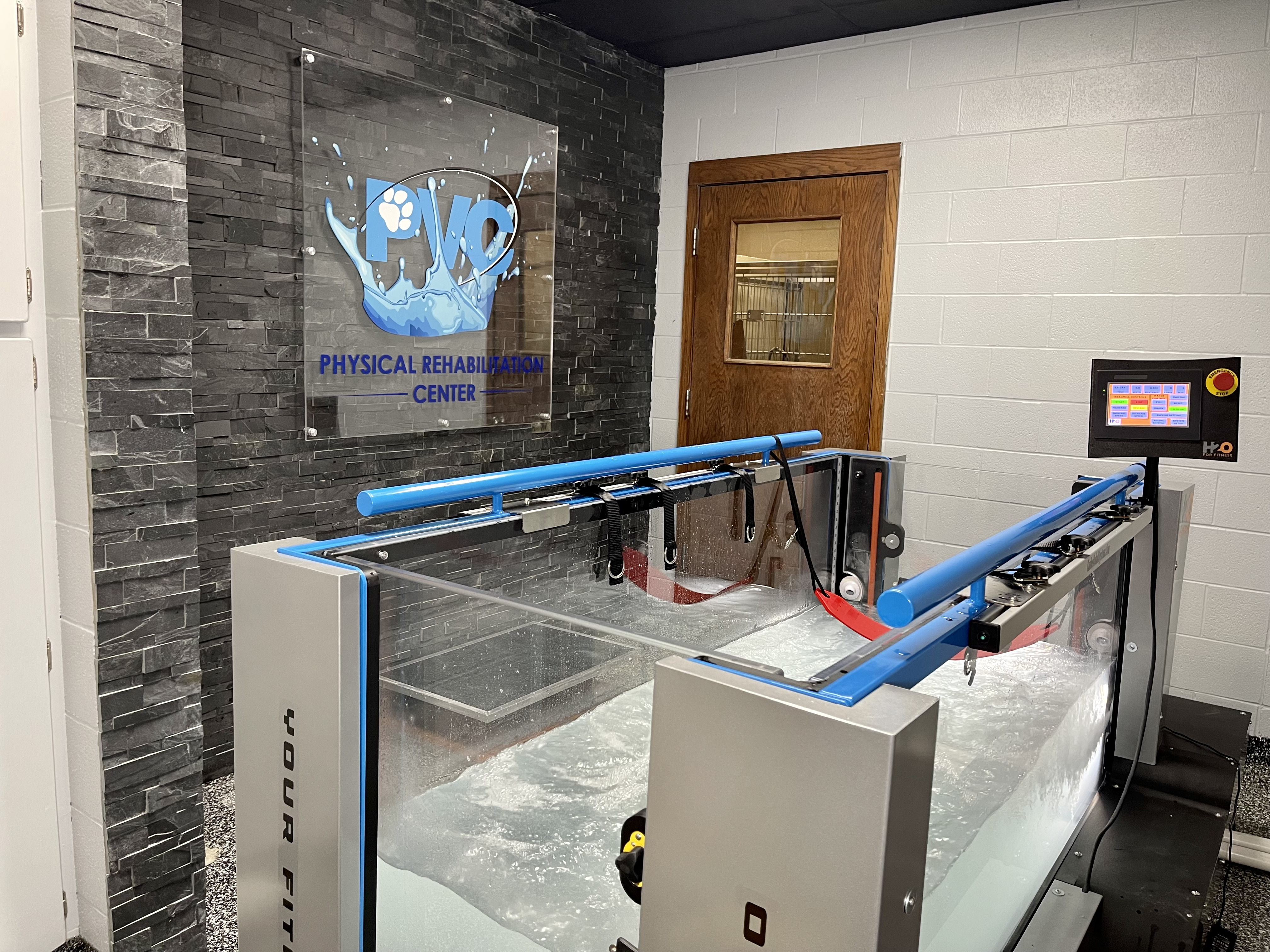 • With the ability to adjust the water level, we are able to allow your pet to swim. Swimming lets them move their limbs through range of motion, when they are hesitant to do so when walking.